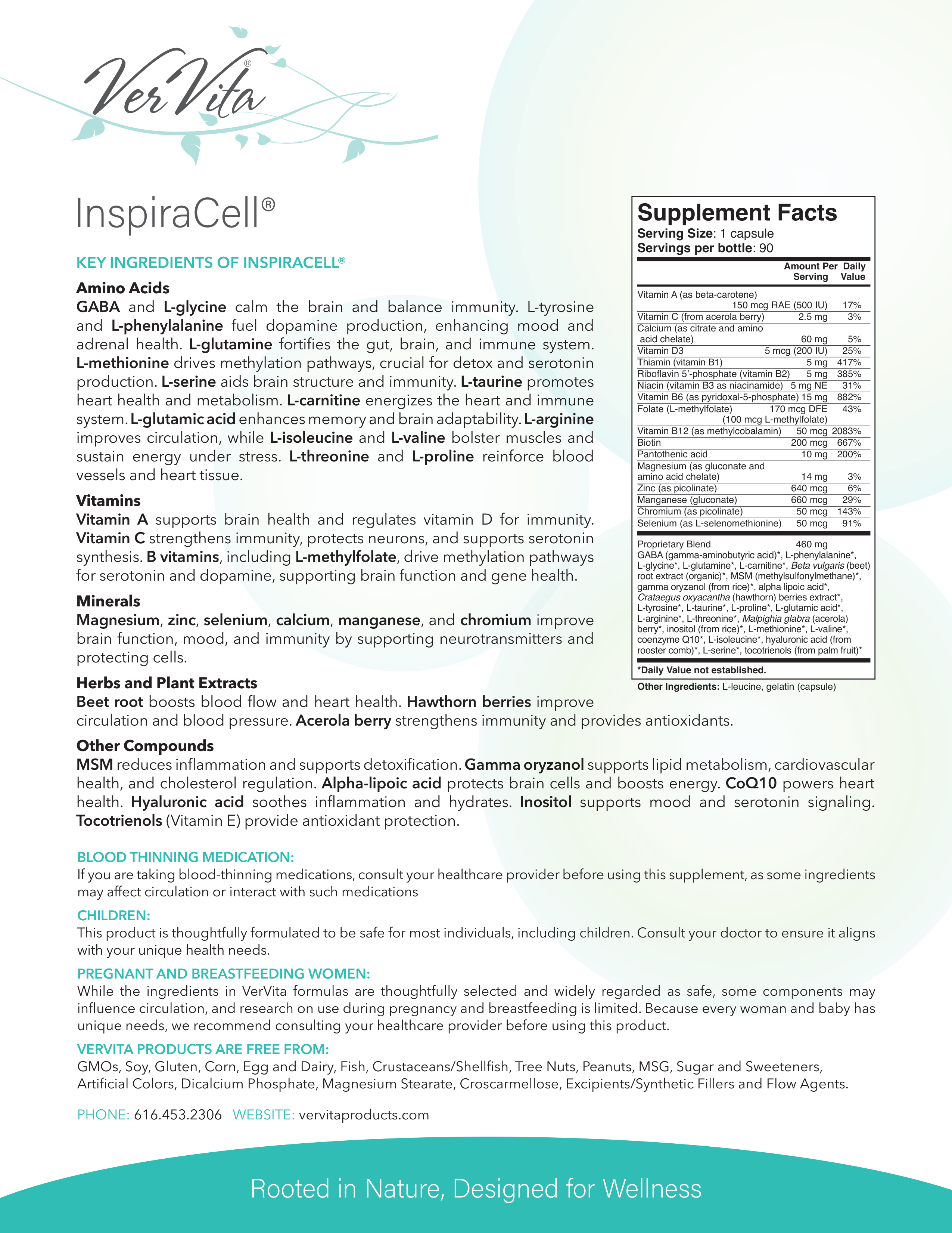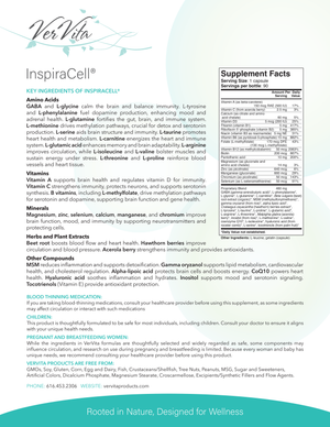 Amino acids in InspiraCell carry oxygen throughout the body. They are also the building blocks for neurotransmitters that carry messages in the brain. This promotes growth, cellular replication, optimal memory, learning, and brain function. Other primary ingredients support the heart, liver, kidneys, adrenals, and immune system for optimal health.