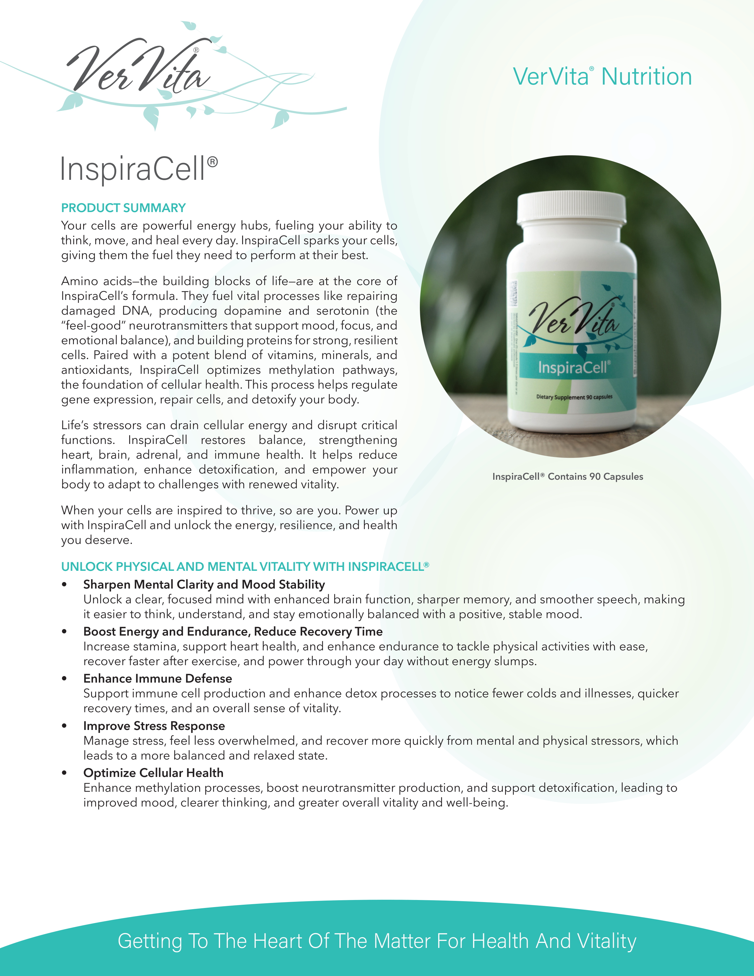 Inspire is a life-giving action. InspiraCell (inspire-a-cell) provides the body with nutrients that fuel the growth and replication of healthy cells, especially those of the heart, brain, and immune system. This intricate formula was originally designed to provide the nourishment for the restorative balance needed by those bodies overwhelmed with complex physical illnesses and/or mental and emotional disorders.