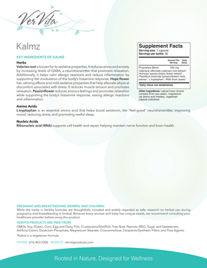 There is no substitute for a healthy diet, appropriate exercise, and times of rest and restoration. Yet for some, that’s not enough. The herbs, vitamins, and minerals in Kalmz have been used for years to release pain and stress and bring calm and balance to the body, physically and emotionally. The herbs in this vegetarian formula gently assist the body in detoxifying negative chemistries that affect the brain, stomach, bladder, and other organs in the body.