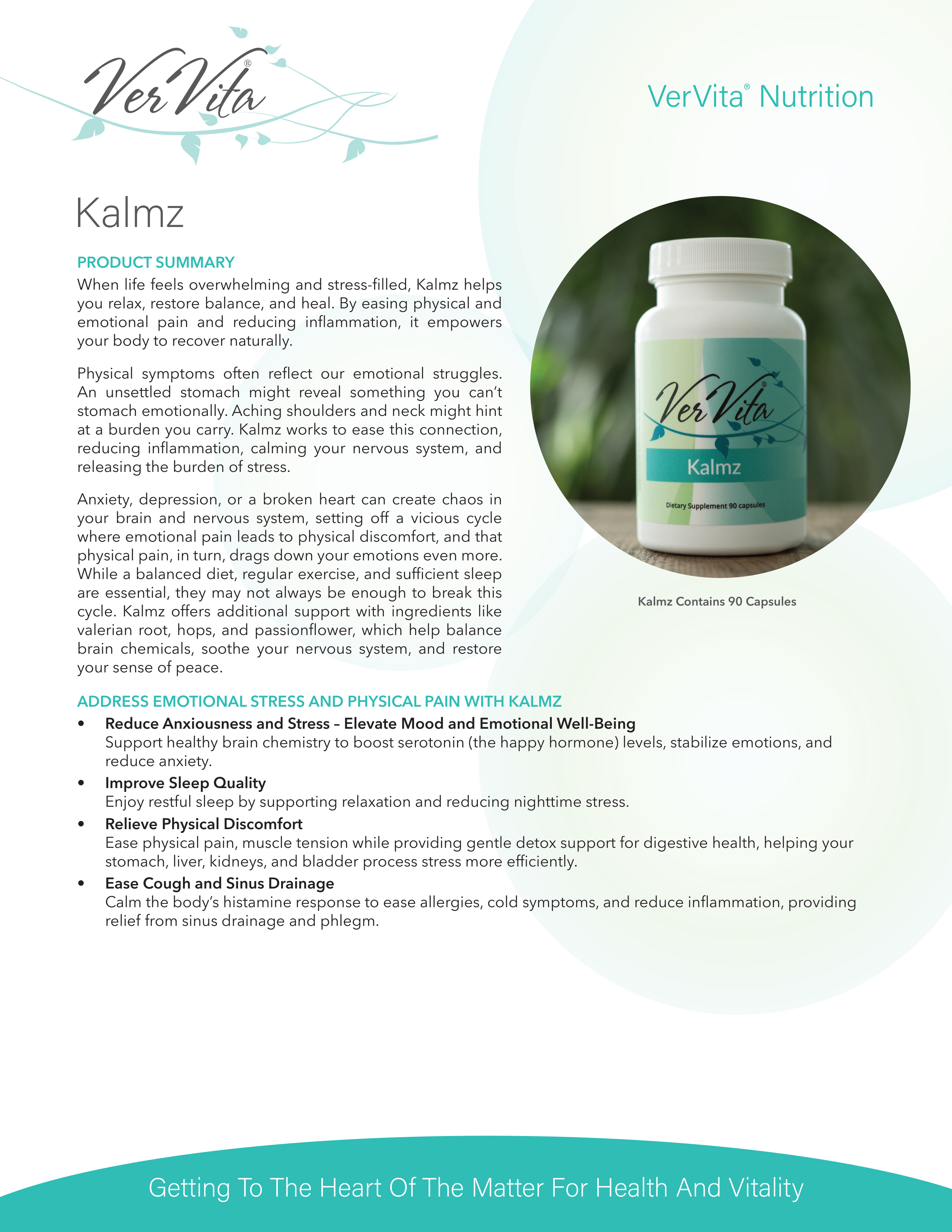 Kalmz provides nutritional support for the body that needs to release physical pain and emotional stress. It also calms the toxic chaos that may overwhelm the body by denaturing (neutralizing) toxins from food, emotions, and/or the environment.